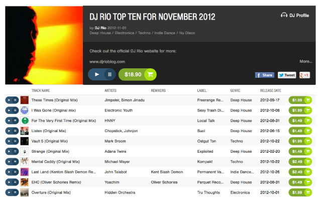 DJ RIO Beatport Top Ten For November 2012 Posted on November 2, 2012 My new picks for November. Click on the image, or click HERE to link up to hear ’em. Share this: Click to share on Facebook (Opens in new window) Facebook Click to share on X (Opens in new window) X Click to email a link to a friend (Opens in new window) Email Click to share on LinkedIn (Opens in new window) LinkedIn Click to share on WhatsApp (Opens in new window) WhatsApp Click to share on Pinterest (Opens in new window) Pinterest Click to share on Reddit (Opens in new window) Reddit Like Loading... Related