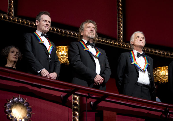 Rock band Led Zeppelin, from left, keyboardist/bassist John Paul Jones, singer Robert Plant, guitarist Jimmy Page, stand as the Star Spangled Banner is played during the Kennedy Center Honors Gala at the Kennedy Center in Washington, Sunday, Dec. 2, 2012. While Led Zeppelin is being honored as a band, surviving members Jones, Page, and Plant, each received the Kennedy Center Honors. (AP Photo/Manuel Balce Ceneta)
