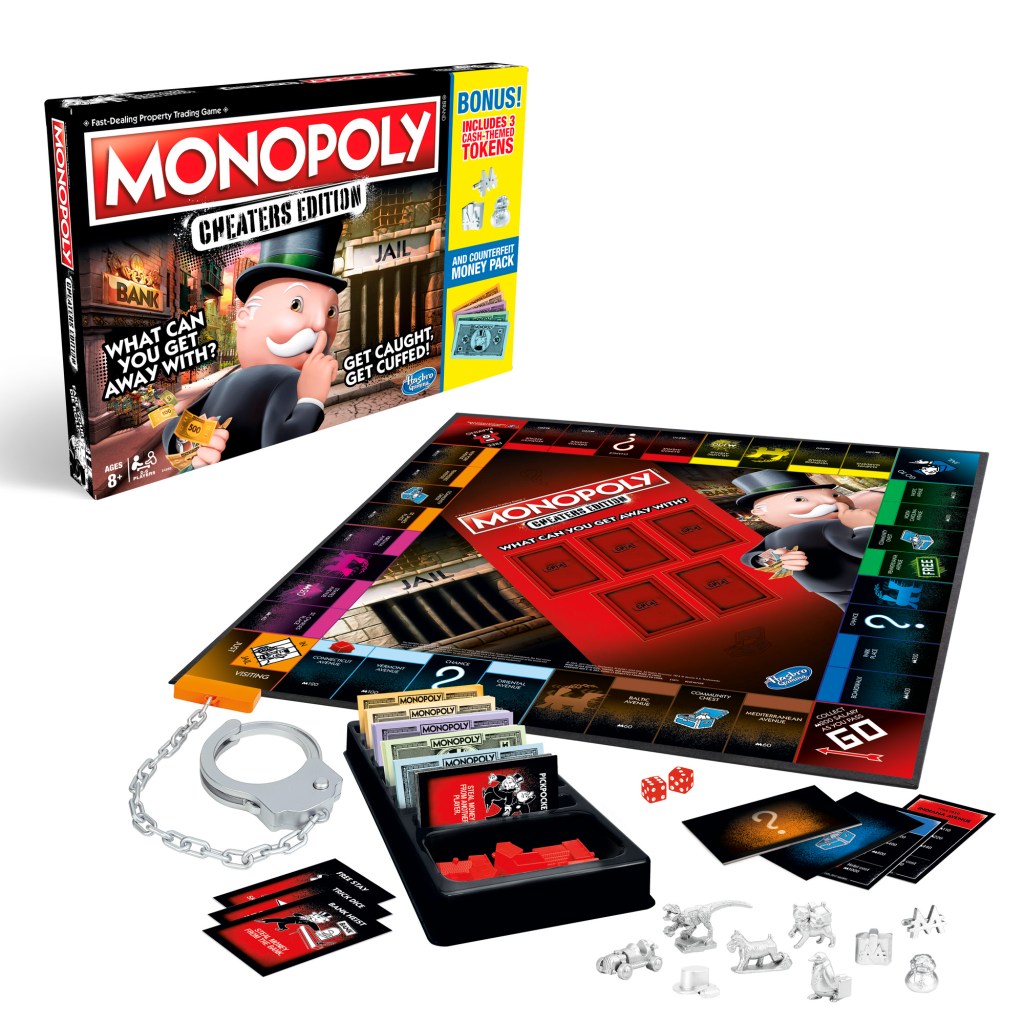 It’s the classic board game of Monopoly that encourages you to break the rules of the game in an official Cheaters Edition put out by Hasbro. What is a bit sadistic are the plastic handcuffs that ARE included.